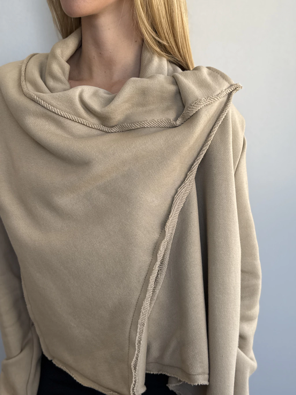 El Saco Bari está confeccionado en algodón rústico pesado, con cuerpo, textura y un estilo que se impone. Su diseño amplio, con costuras a la vista y cuello tipo shawl envolvente, lo convierte en una prenda clave para usar como capa liviana en los días frescos.